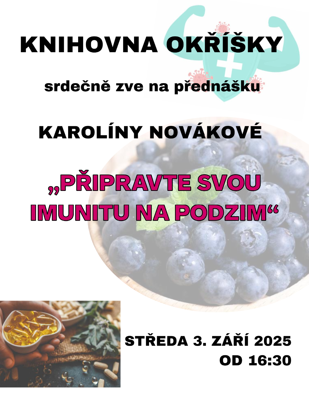 Vážení čtenáři, z důvodu čerpání dovolené bude knihovna uzavřená 30. 6. a od 28. 7. do 6. 8. 2025. Vaše výpůjčky budou prodlouženy.